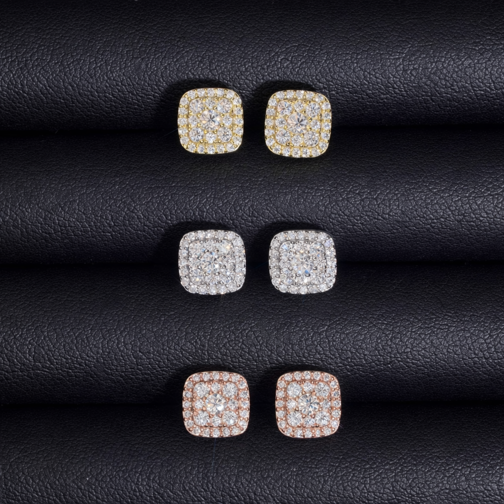 Orecchini dal design quadrato con cornice halo doppia, pensati per massimizzare brillantezza e presenza al lobo.