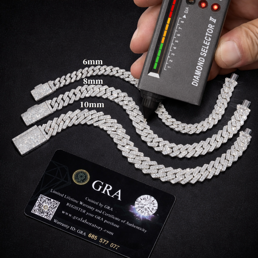 Incastonato con moissanite VVS di altissima qualità, selezionata per offrire fuoco intenso, purezza elevata e riflessi multidimensionali. Ogni maglia cattura la luce da ogni angolazione creando un effetto iced totale.