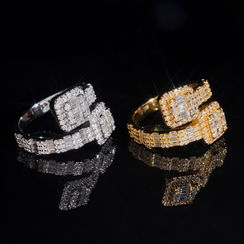 Taglio baguette e pavé combinati per una resa luminosa intensa e sofisticata, perfetta per chi ama distinguersi.